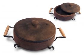 Podnitsa /deep earthen baking dish/ on metal stand D25 cm