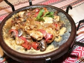 Podnitsa /deep earthen baking dish/ on metal stand D28 cm