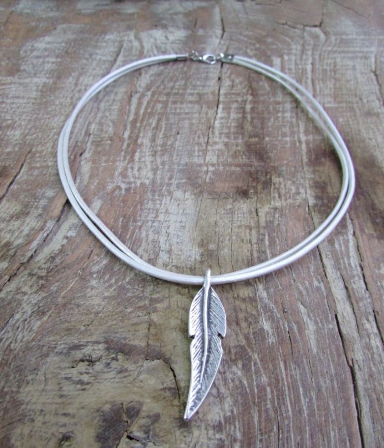 Feather necklace for children of genuine leather and anti-allergic metal. Length: 44 cm.