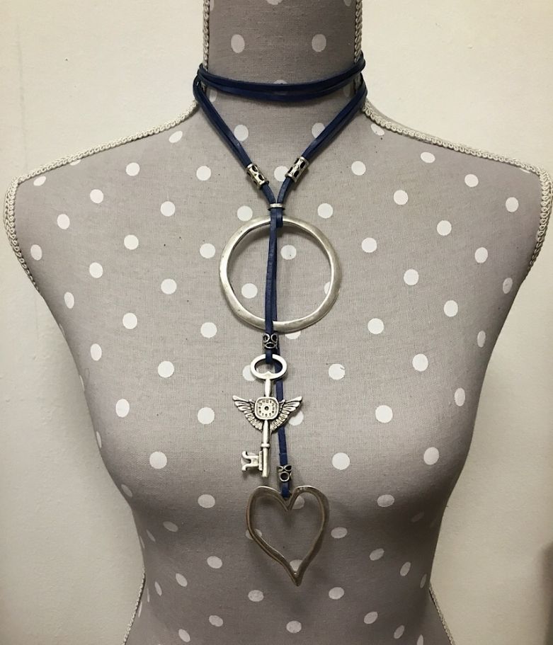 Hand-made long necklace of genuine leather and anti-allergic metal elements. No clasp.