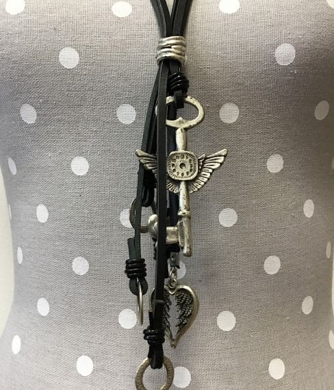 Key long necklace of genuine leather and anti-allergic metal elements.