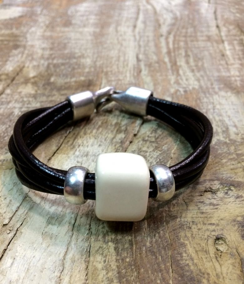 Красива гривна Керамично кубче. Гривната е изработена от естествена кожа и керамика. Закопчалката е от антиалергичен метал без съдържание на никел. Дължина: 19см. габ. Създадено в България.