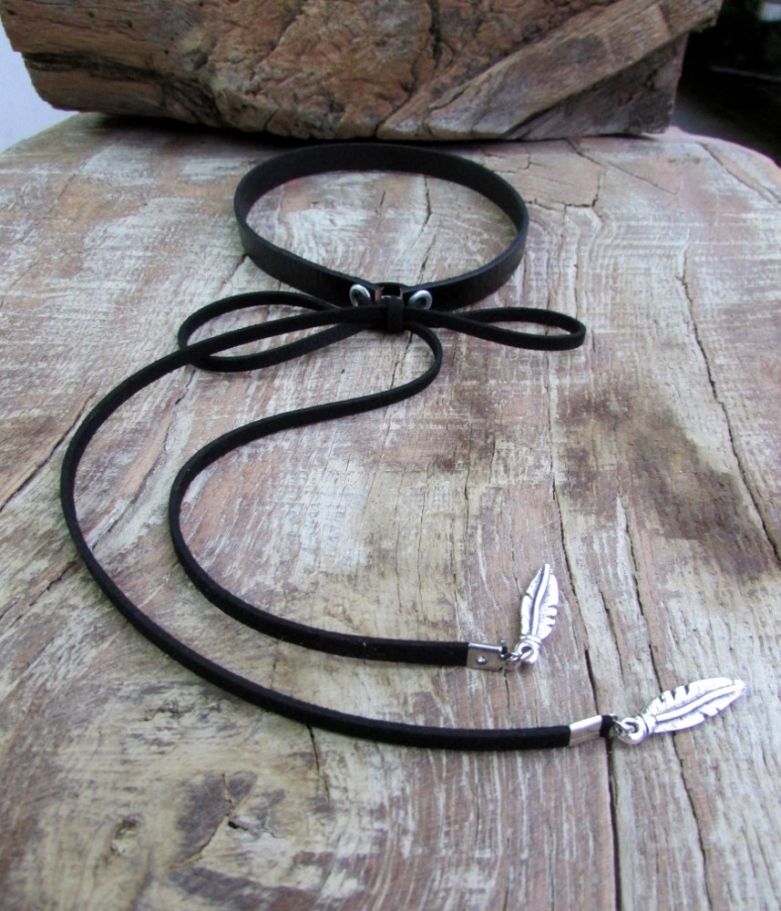 Колието е изработено от естествена кожа, велур и антиалергичен метал. Колието е без закопчалка, слага се през главата и се завързва отпред.