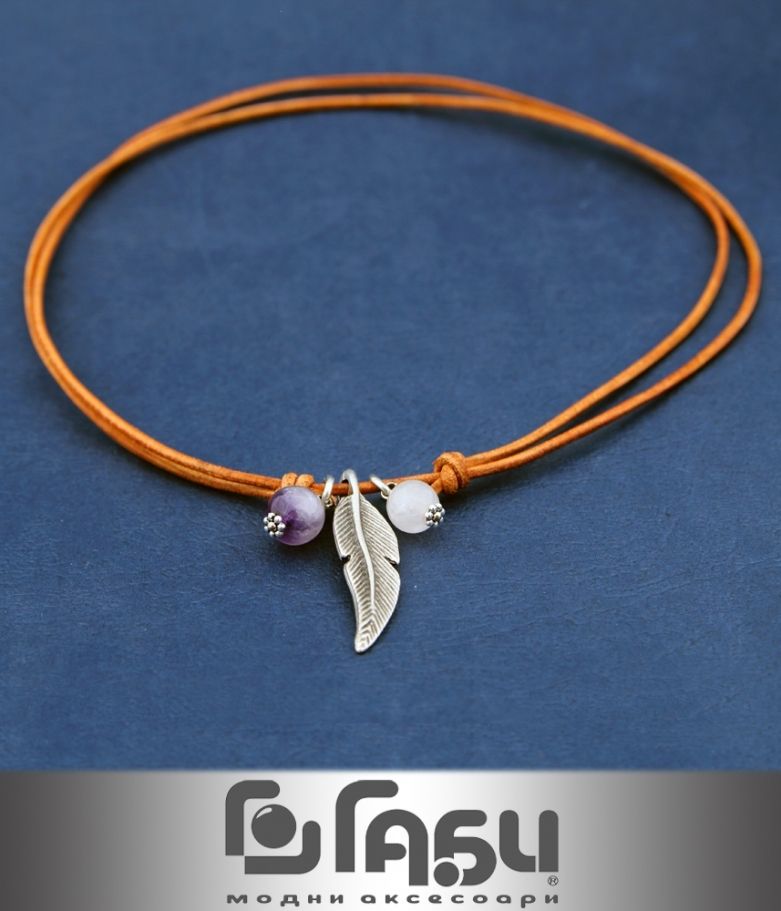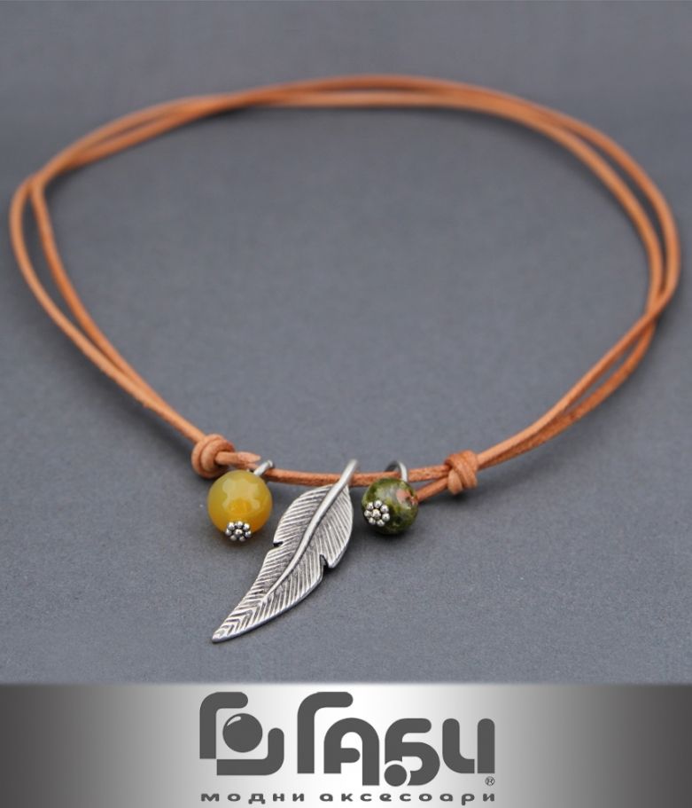 Колието е изработено от естествени камъни, естествена кожа и антиалегричен метал. Дължината на колието варира. габ. Произведено в България.