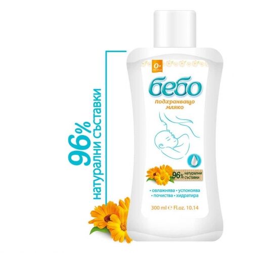 Подхранващо мляко - Бебо 300мл. Екстрактът от невен е безценен с успокояващите и регенериращите си свойства. Натурален фосфолипиден комплекс - сензацията в съвременната козметика, благодарения на която кожата остава хидратирана. Създава върху нея защитна бариера и засилва устойчивостта й. Възстановяване и поддържане на кожната бариера. Лека консистенция за лесно разнасяне и богато усещане за подхранване. Подходящо за деца и възрастни с чувствителна кожа, склонна към сухота.