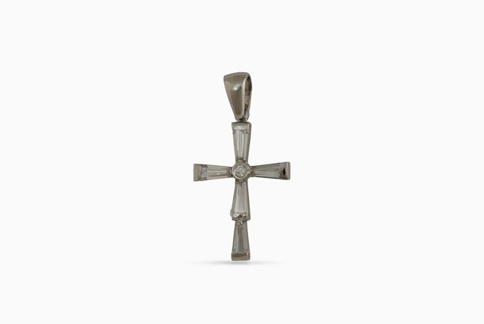 Златен кръст, ръчна изработка от бяло 14 каратово злато, проба 585 и вграден цирконии. Грамаж ок. 1.51 грама.