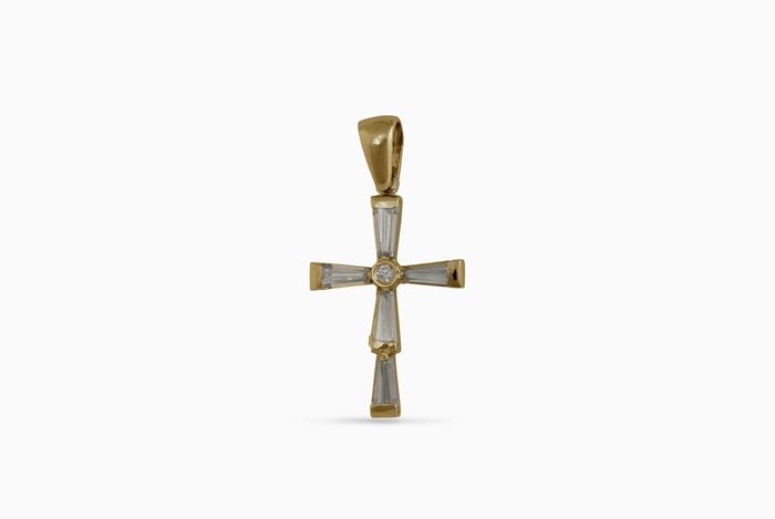 Златен кръст, ръчна изработка от бяло и жълто 14 каратово злато, проба 585 и вграден цирконий. Грамаж ок. 1.69 грама.
