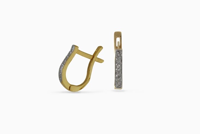 Златни обеци с вградени цирконии. Ръчна изработка от бяло и жълто 14 каратово злато, проба 585. Грамаж ок.1.72 грама. При покупка получавате обеците със сертификат и гаранция от магазин. При изчерпване, срак за изработка 10 работни дни. кул. №1886. Произведено в България.