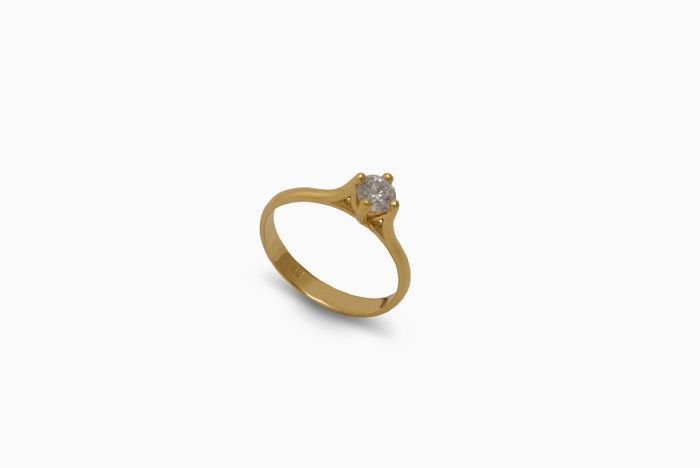 Златен пръстен, ръчна изработка от жълто 14 каратово злато, проба 585 и вграден цирконий. Грамаж ок. 1.98 грама.