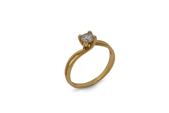 Златен пръстен, ръчна изработка от жълто 14 каратово злато, проба 585 и вградени цирконий. Грамаж ок.1.91 грама.